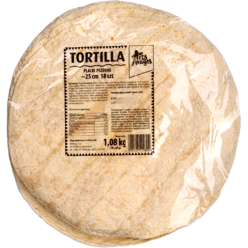 Odkryj doskonały smak i uniwersalność naszych pszennych tortilli o średnicy 25 cm! Wykonane z najwyższej jakości składników, nasze tortille są elastyczne i idealnie nadają się do zawijania ulubionych nadziewanych dań. Doskonałe jako podstawa dla taco, burrito czy quesadilli, nasze tortille pszenne dodają autentycznego smaku i tekstury każdemu posiłkowi, tworząc niezapomniane doznania kulinarne.